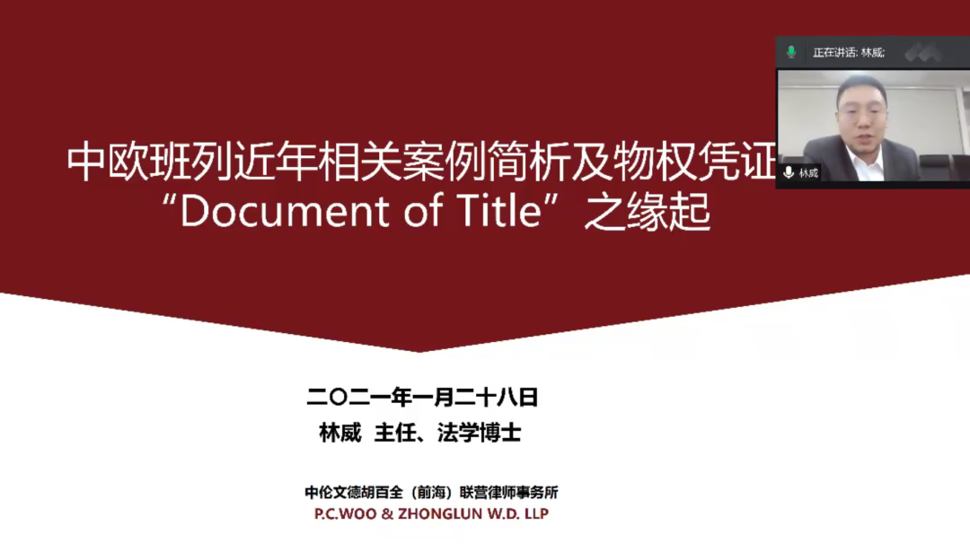 2021年1月28日下午,“首届中欧班列法治论坛”线上研讨会顺利召开。本次论坛主办方为中国海事仲裁委员会、中国社会科学院国际法研究所、中国国际货运代理协会、中国海商法协会、中国社会科学院海洋法治研究中心,协办方为中伦文德胡百全(前海)联营律师事务所,本所还承担了包括草拟问题单、大数据检索、专项研究等相关准备工作。相关政府部门、司法机关、金融机构、物流界、海事海商实务界、学术界等20余名专家代表都积极参与讨论,对有关中欧班列国际铁路提单业务领域的热点问题进行了深入探讨和交流。