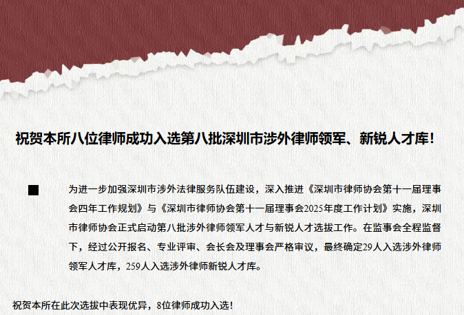 祝贺本所八位律师成功入选第八批深圳市涉外律师领军、新锐人才库!为进一步加强深圳市涉外法律服务队伍建设,深入推进《深圳市律师协会第十一届理事会四年工作规划》与《深圳市律师协会第十一届理事会2025年度工作计划》实施,深圳市律师协会正式启动第八批涉外律师领军人才与新锐人才选拔工作。在监事会全程监督下,经过公开报名、专业评审、会长会及理事会严格审议,最终确定29人入选涉外律师领军人才库,259人入选涉外律师新锐人才库。祝贺本所在此次选拔中表现优异,8位律师成功入选!涉外律师领军人才(1位):梁新越 律师 涉外律师新锐人才(7位):按照姓氏拼音排序付颖频 律师、何琪 律师、刘源 律师、林琳 律师、宁宁 律师、帕丽丹·艾赛提 ...
